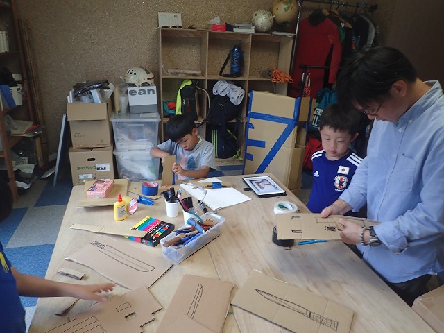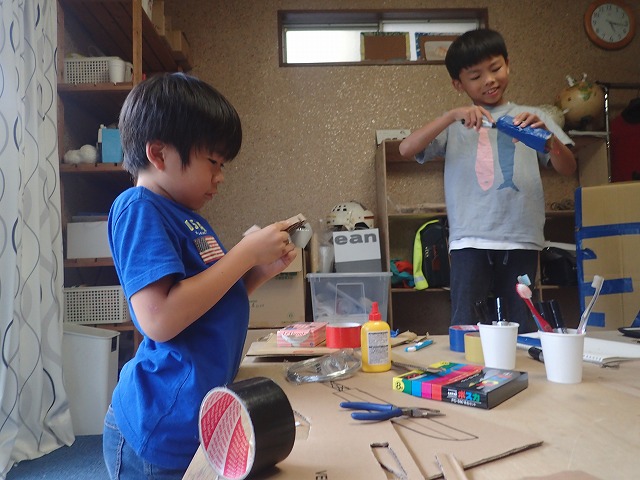 今日は先週使った段ボールがまだ大量にあるので、それを使って自由に作ろうと提案しました。