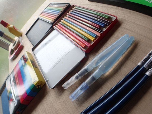 水彩色鉛筆、アクリル絵の具、ポスカ、普通の色鉛筆、もちろんほかにもたくさんあるけど、