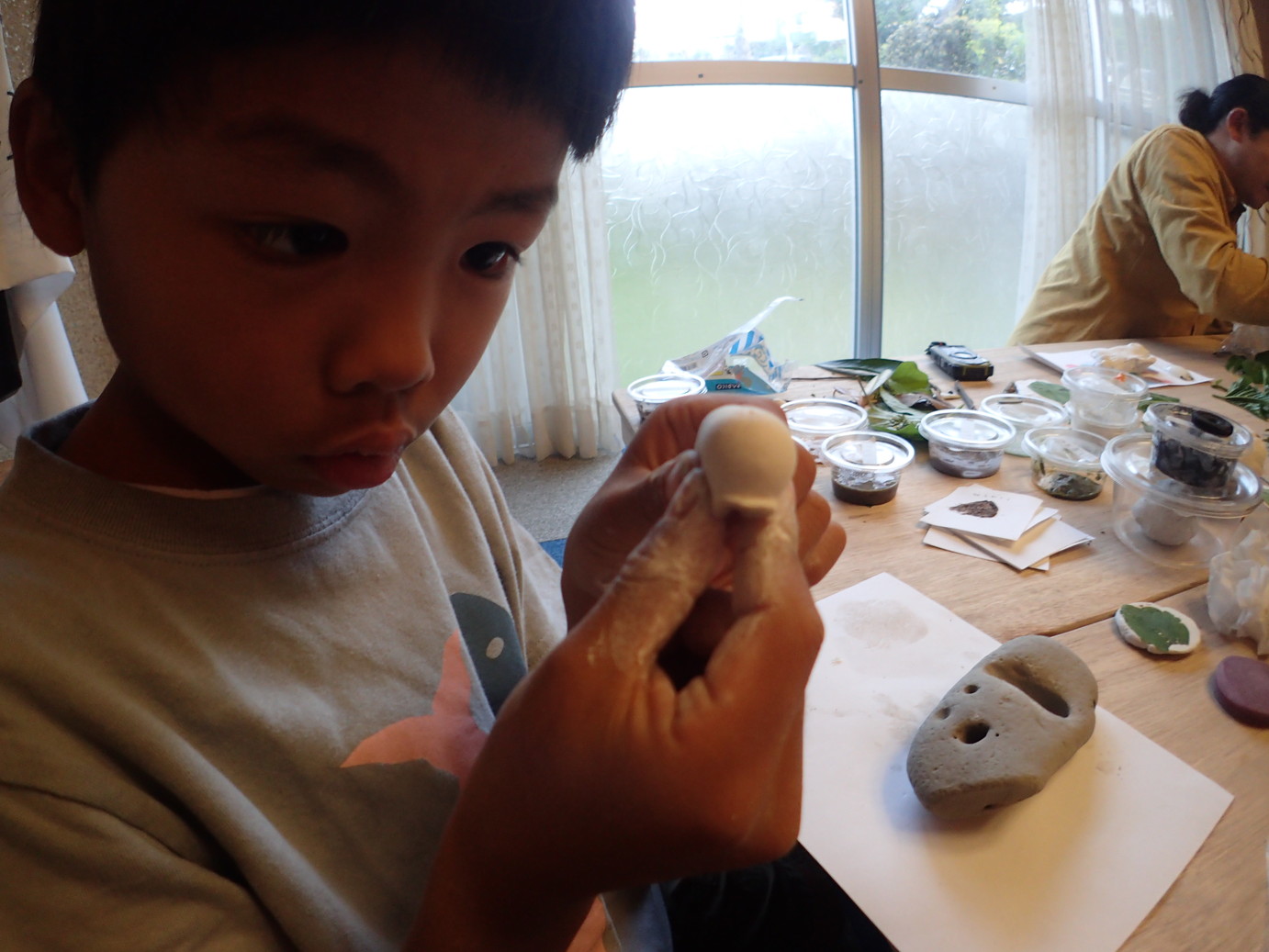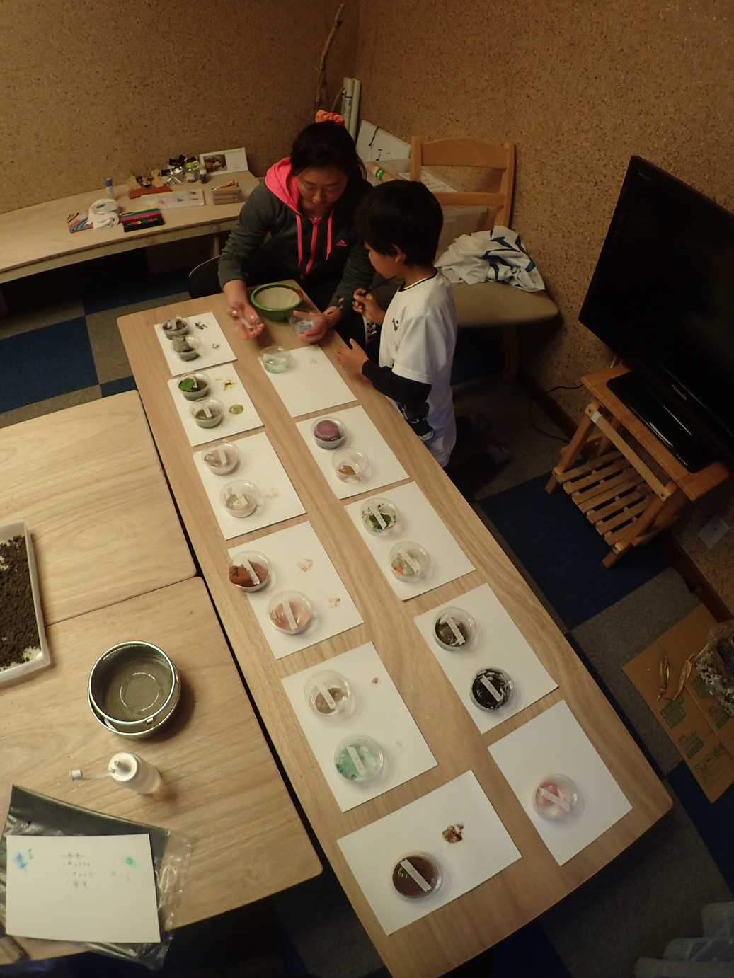 天候に恵まれず、新しい材料を探しに行くことができなかった今回でしたが、素材を組み合わせるという発想によって新たな色も増え、前回つくった分と合わせて20色の絵の具が出来上がりました。