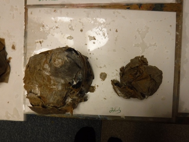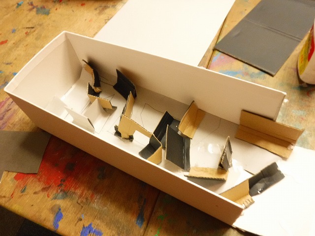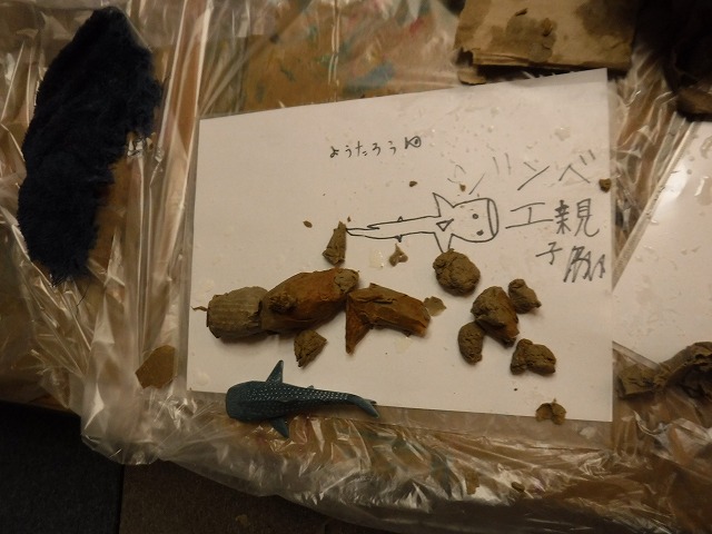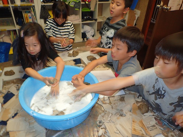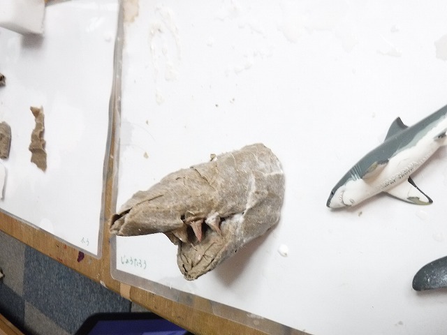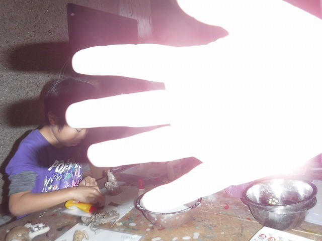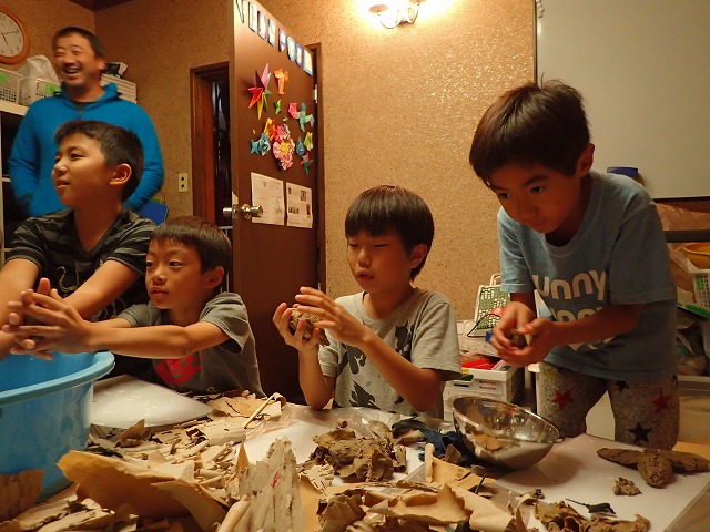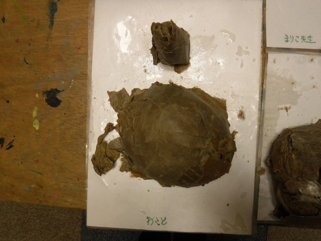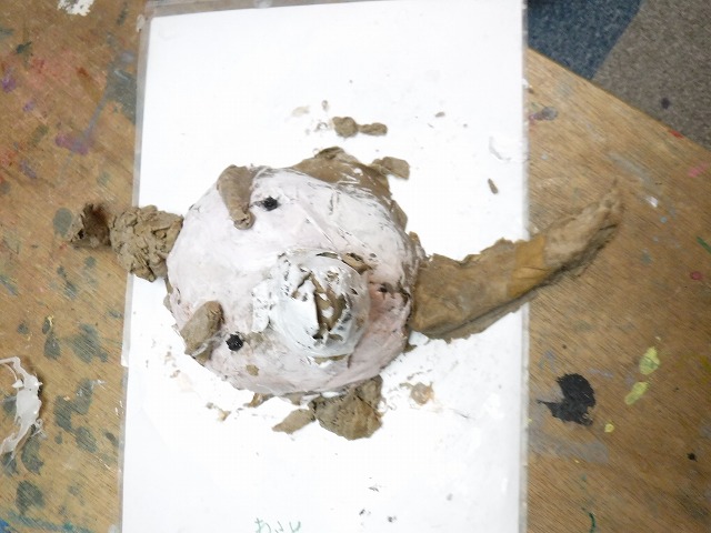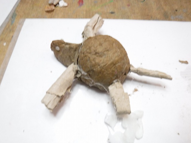 そしてちぎったダンボールをボンド水に浸して粘土のように握って形づくっていきます。