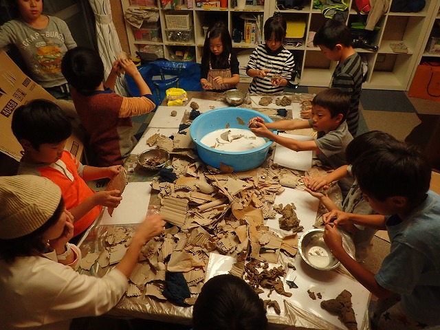 そしてちぎったダンボールをボンド水に浸して粘土のように握って形づくっていきます。