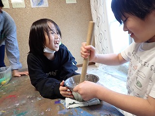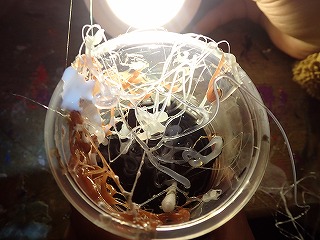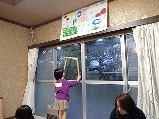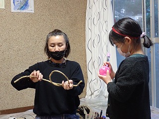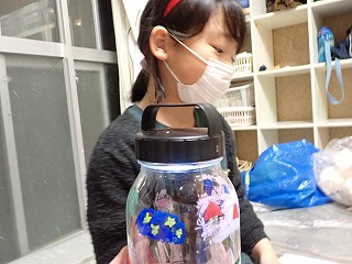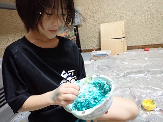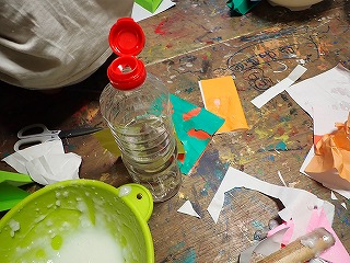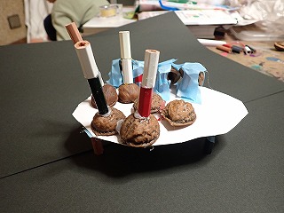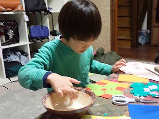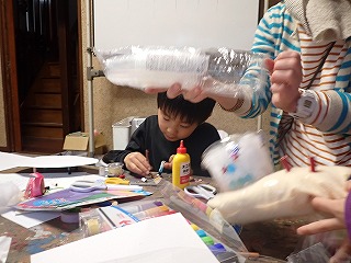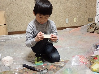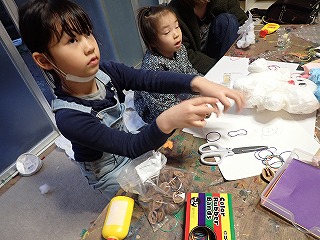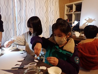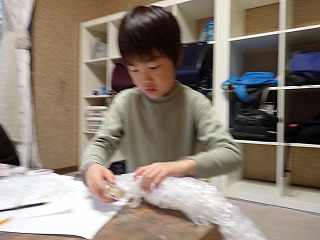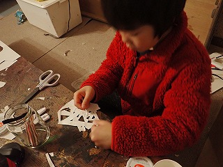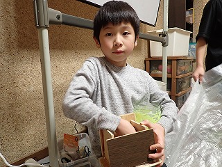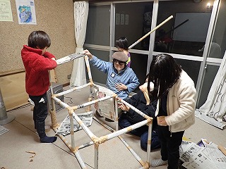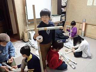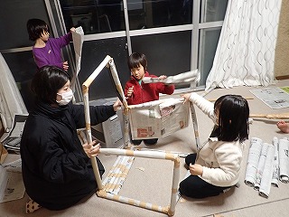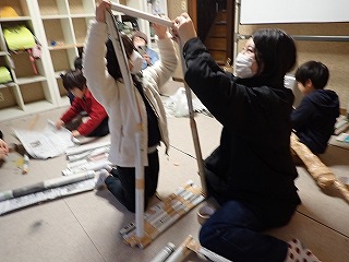 最後の仕上げに弱い部分に筋交いをいれて。すっかり職人のような手さばきで集中して制作していました。真剣な表情が見られてこちらもうれしかったです。