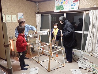 この時点ではまだ不安定なので、複数人で支えながら作ります。