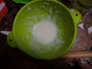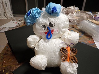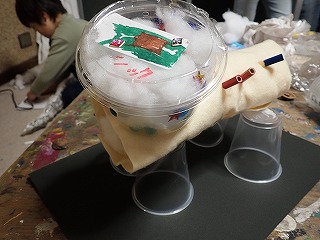 棒状に丸めた新聞紙を支持体にして、つなぎ合わせて立体にしていきます。