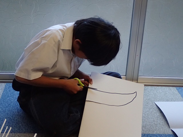 こちらはまず翼を作っていますが、紙を半分に折って切っています。こうすることで左右対称の形が作れますね。バランスよくするためにはシンメトリーが大事!