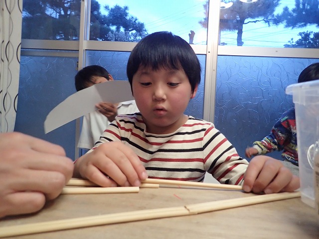 こちらは割りばしで体を作っています。二本をつなげるにはどうしたら良いかな?