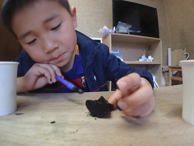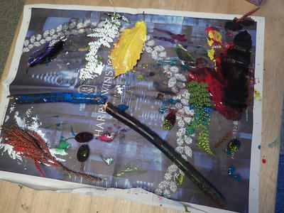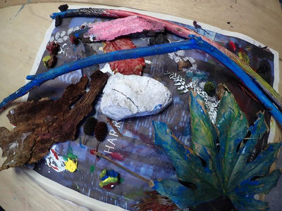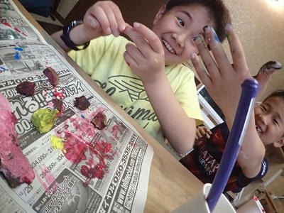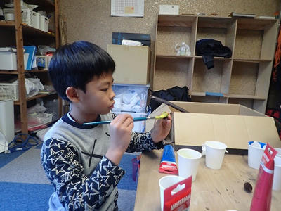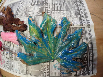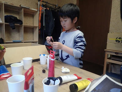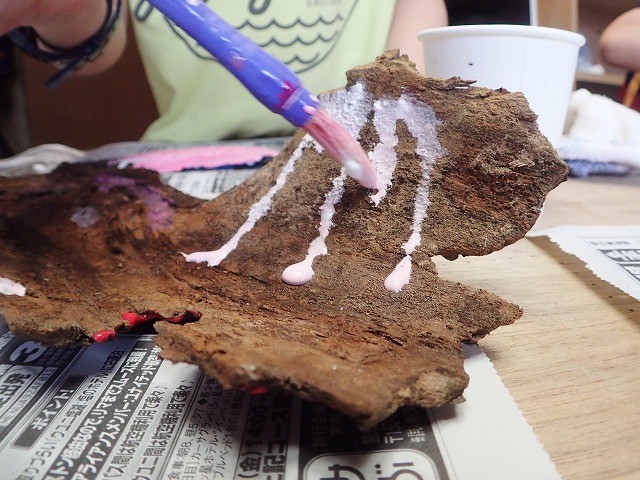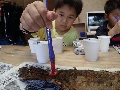 前回の山で拾ってきたものにアクリル絵の具で色を塗ります。