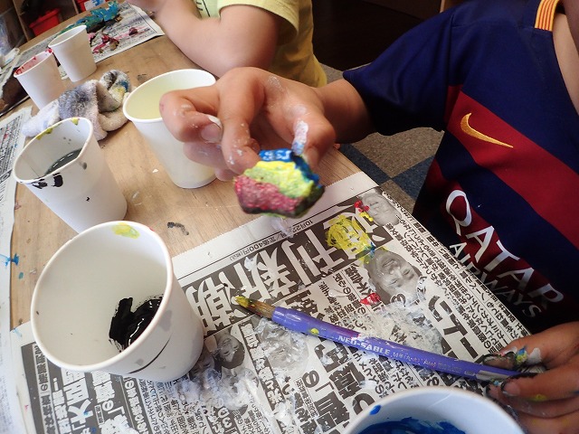 今回いろんなものに色を塗ることでそのものの形がより浮き出て見えたり、違う様に見えたりしました。例えば、白い色に塗った時は光と影がはっきり出てきたり、絵具をさっと塗った時も凹凸の出ているところに色がついて、凹んでいるところは元の色のままだったりしました。