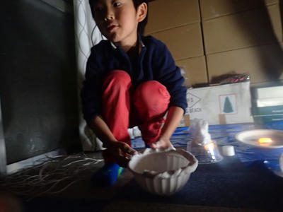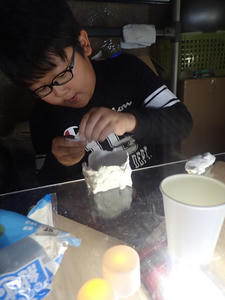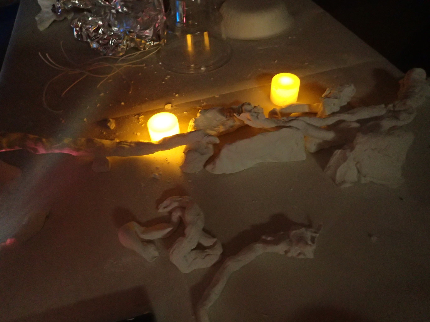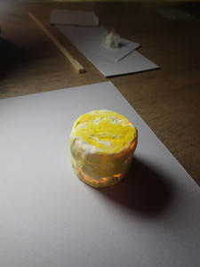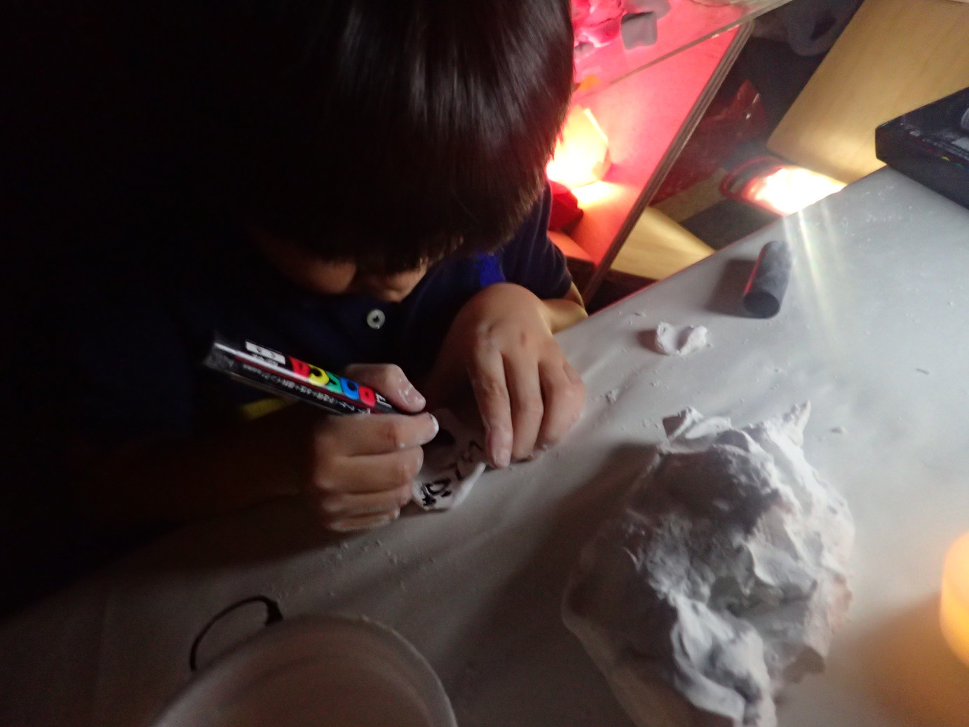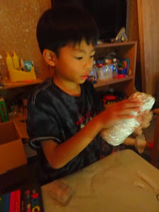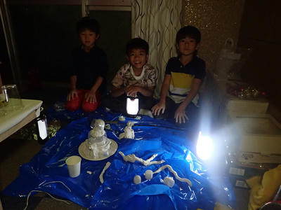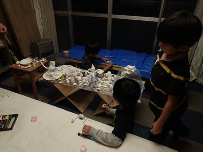 ろうそくやデコレーションに細かい造形を駆使した「ケーキ」や、光が透けるまで薄く延ばして貼った紙粘土に黄色を塗った「よく分からないもの」等いったんそれぞれ別の制作に移行していきました。