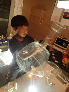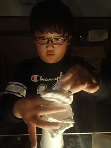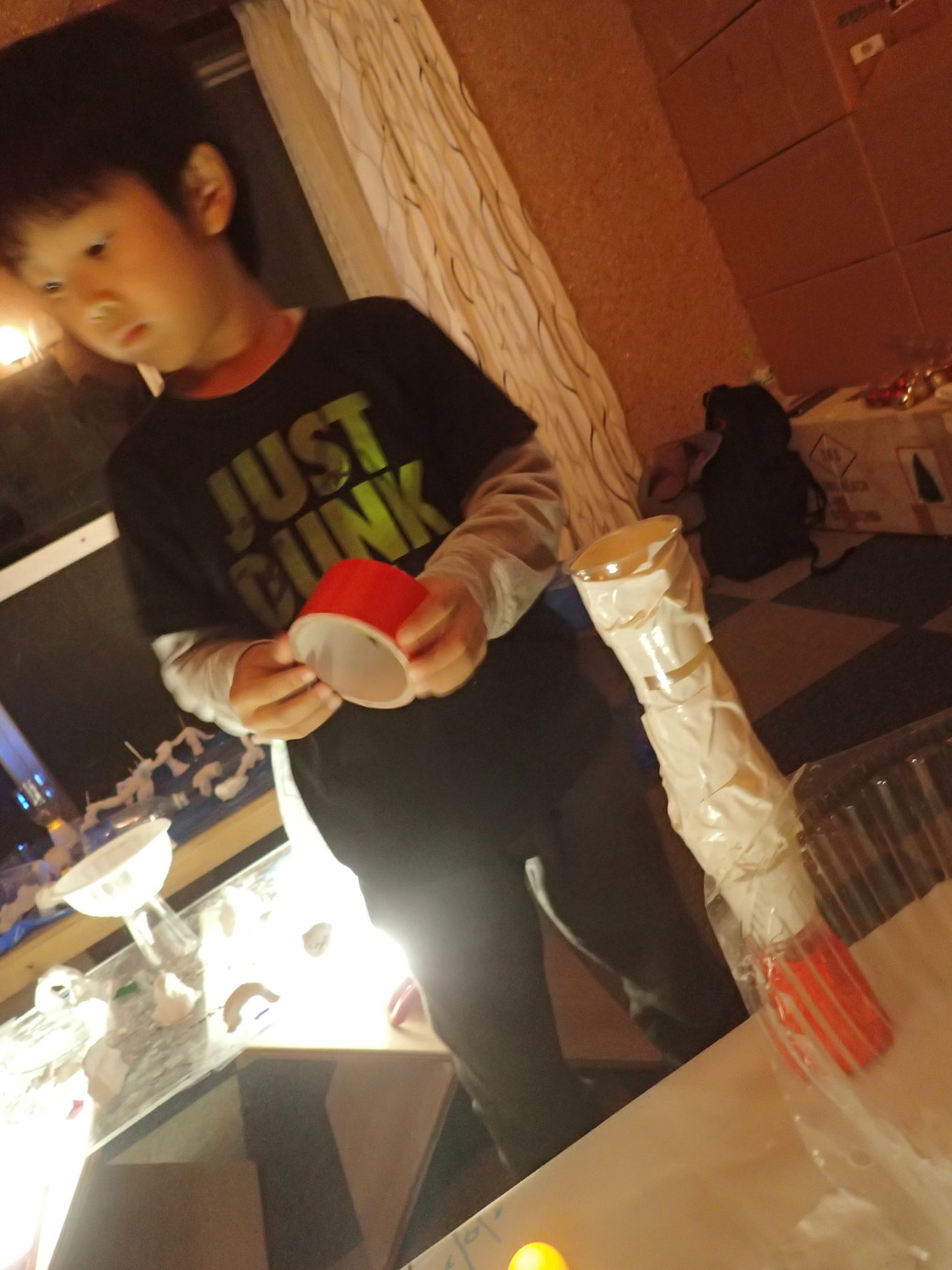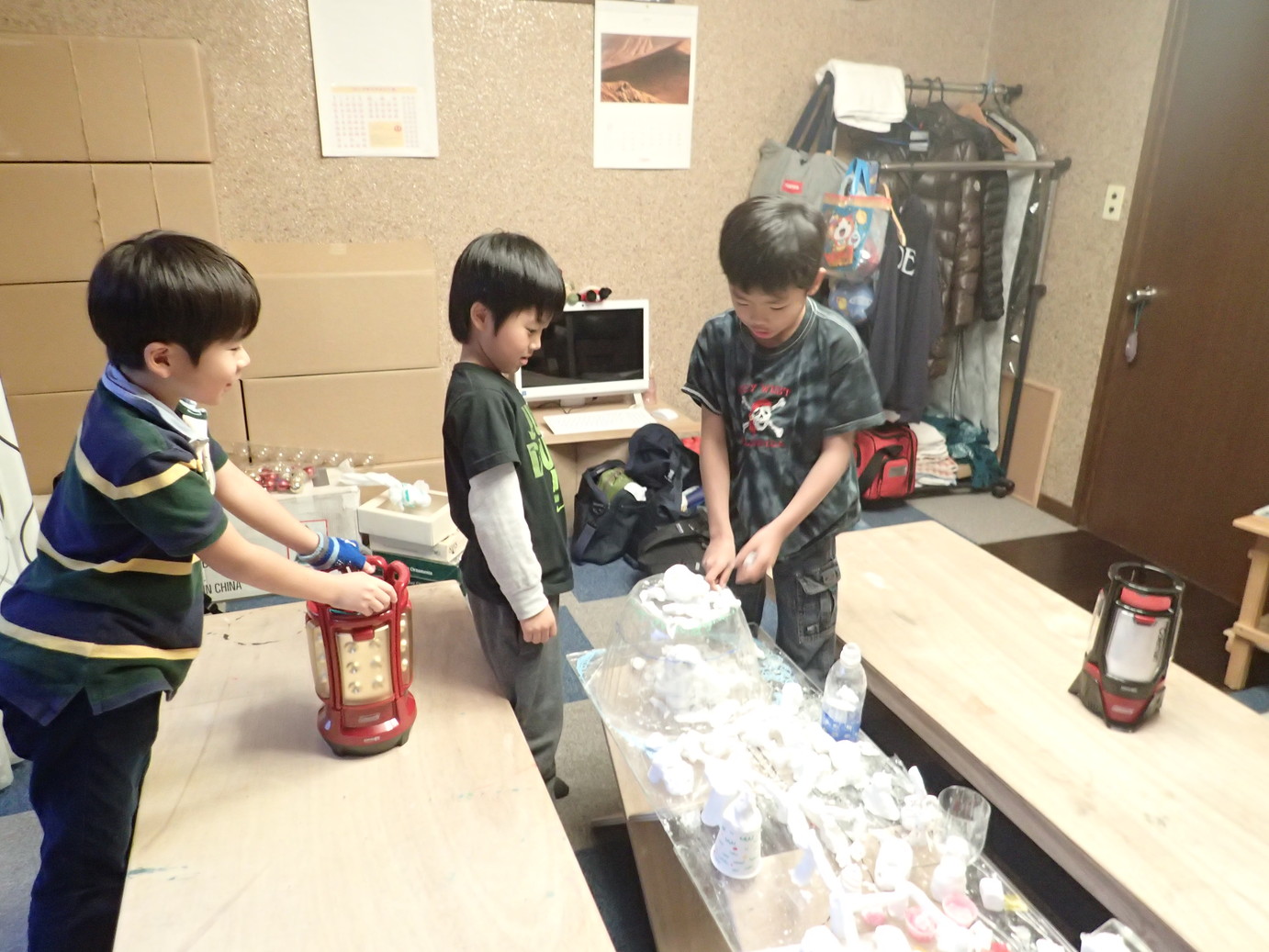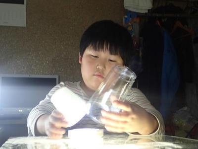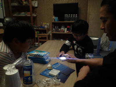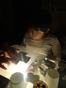 光源と紙コップや紙粘土を前にして、まずは色々と組み合わせてみます。