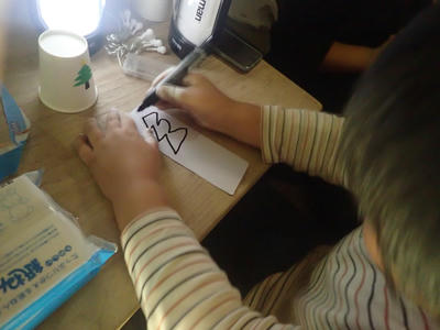 描画した絵を丁寧に切り抜くのに時間がかかってしまいましたが、その分綺麗に出来た型をなぞるとあっという間に「ツリー」が!