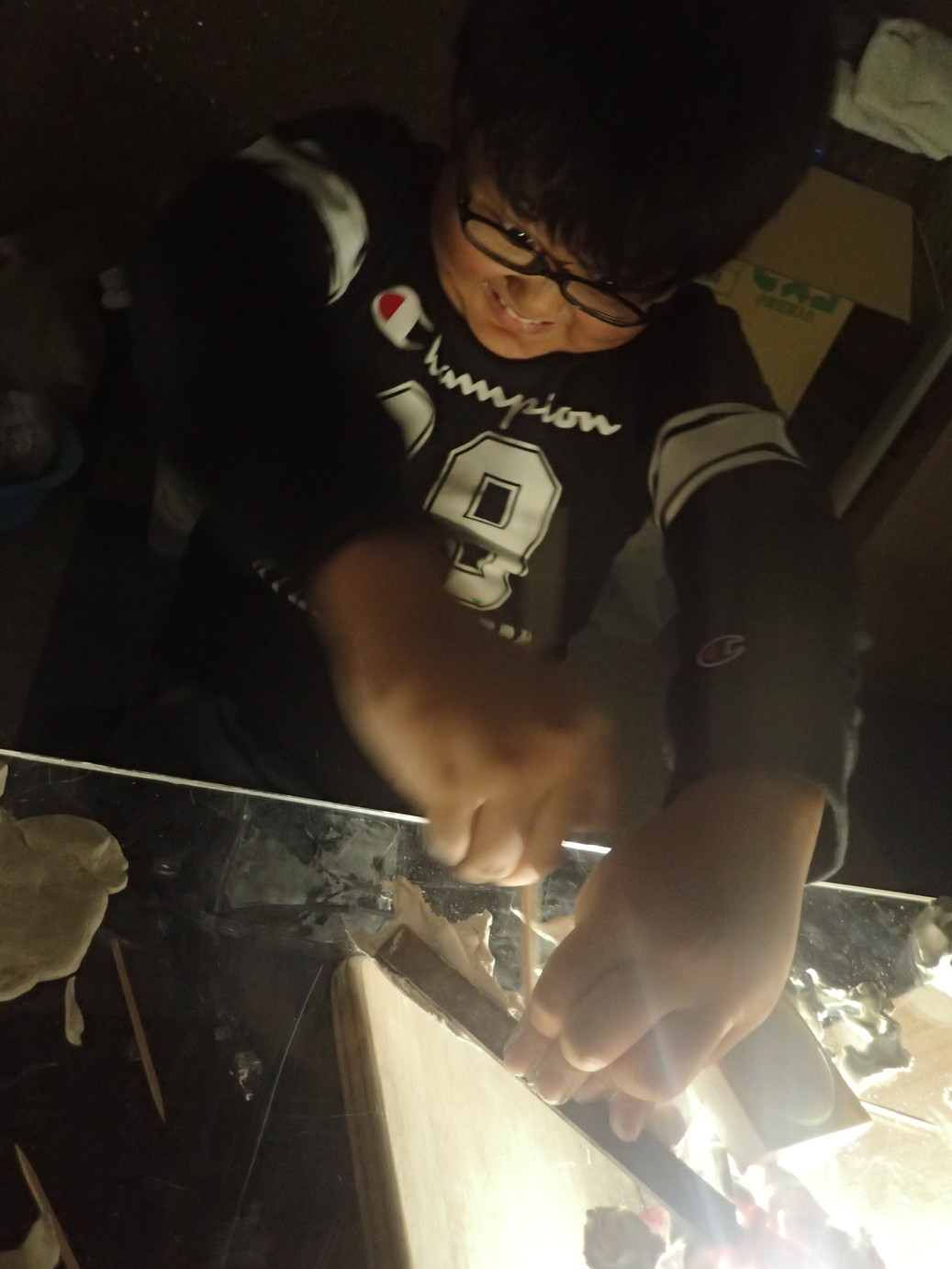 切り出す行為に楽しみを見つける事で創意も発展していき、いくつもつくった箱を「積み重ねたい」という更なる難関に挑戦です。