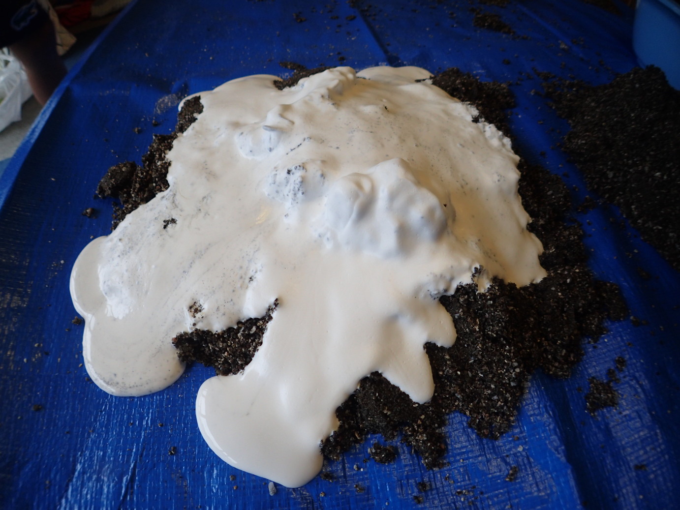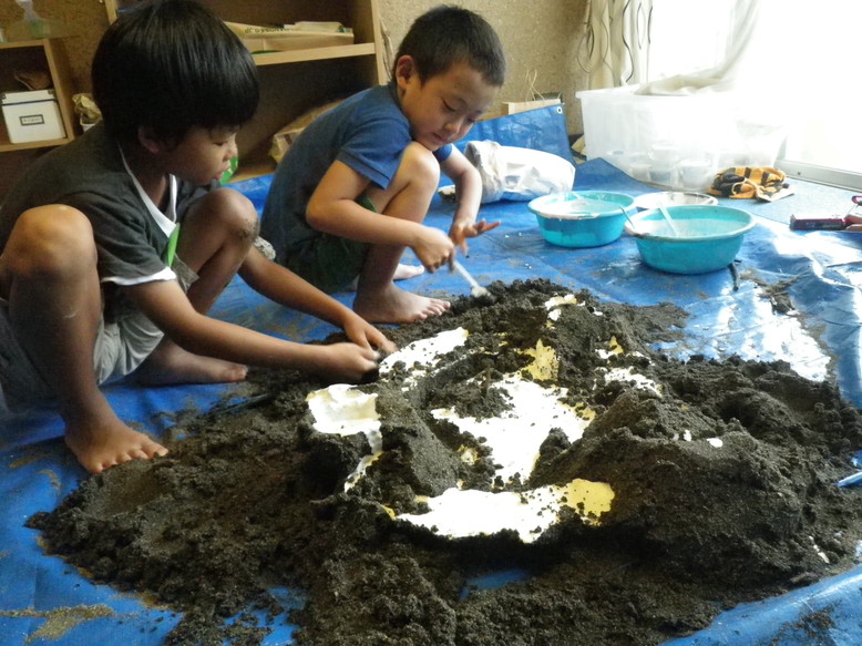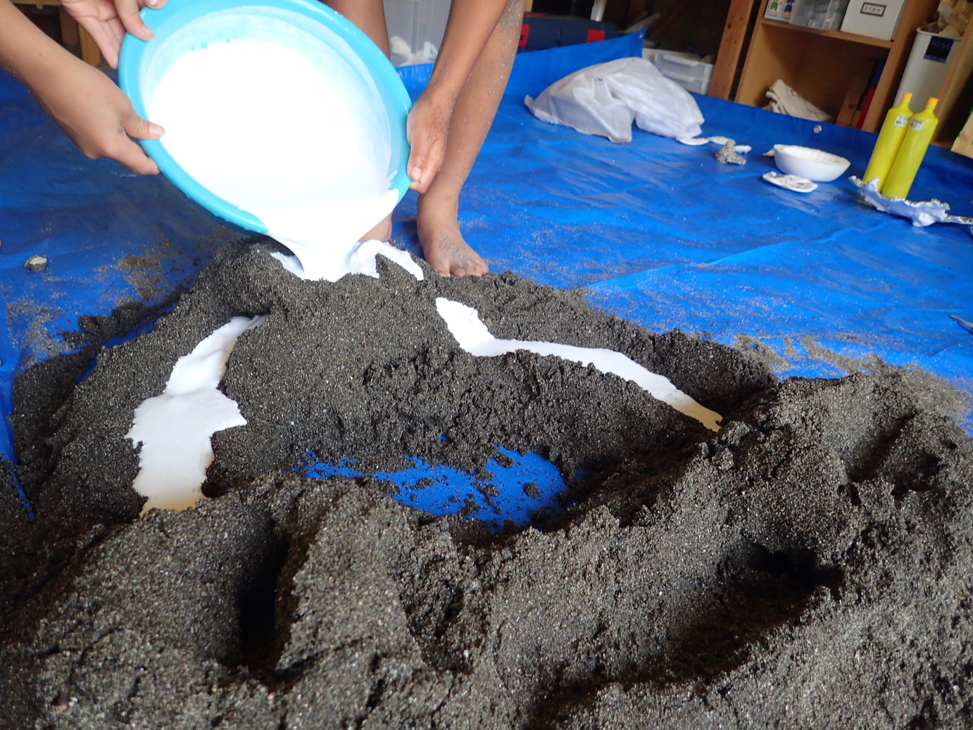 本日はあいにくの雨ですが、あらかじめ持ち帰ってきた砂と新たに材料として加わった石膏とを組み合わせて面白いことが出来ないかを考えてみましょう。