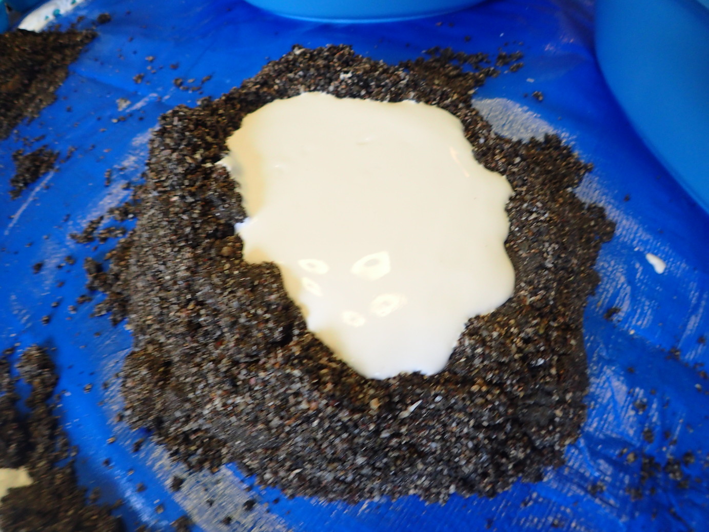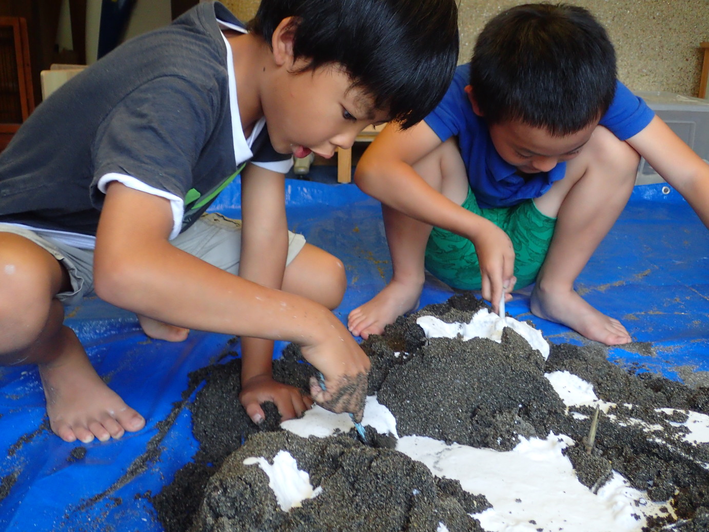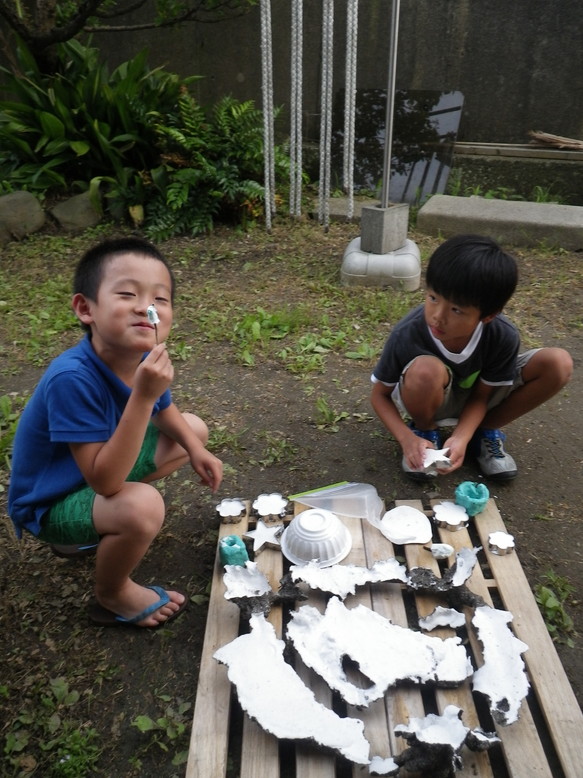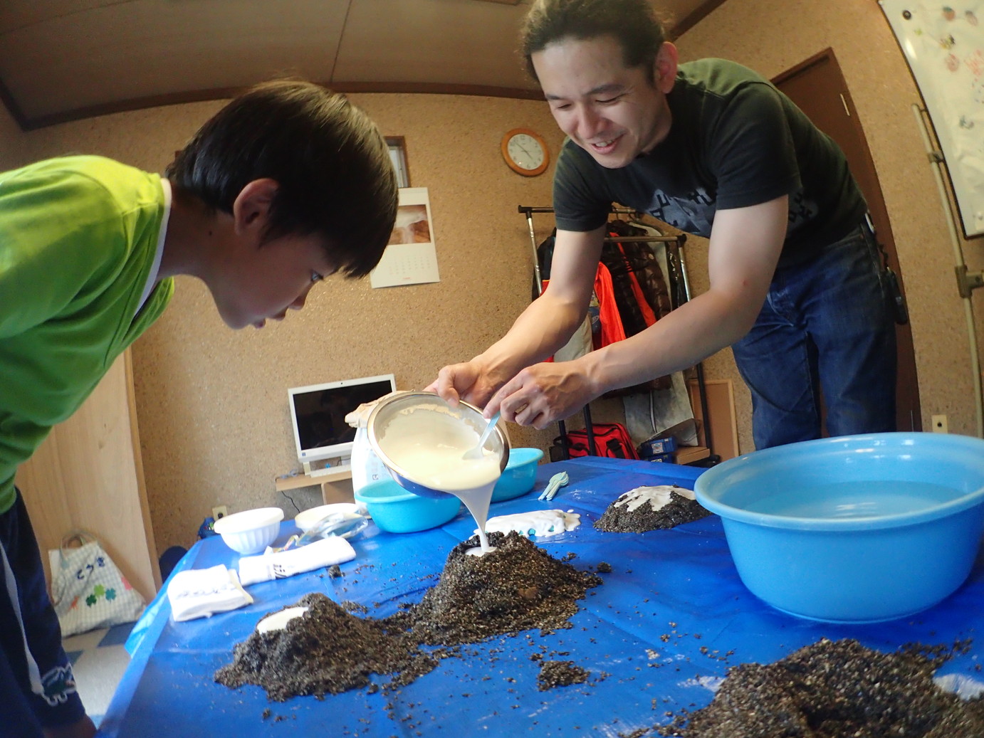 本日はあいにくの雨ですが、あらかじめ持ち帰ってきた砂と新たに材料として加わった石膏とを組み合わせて面白いことが出来ないかを考えてみましょう。
