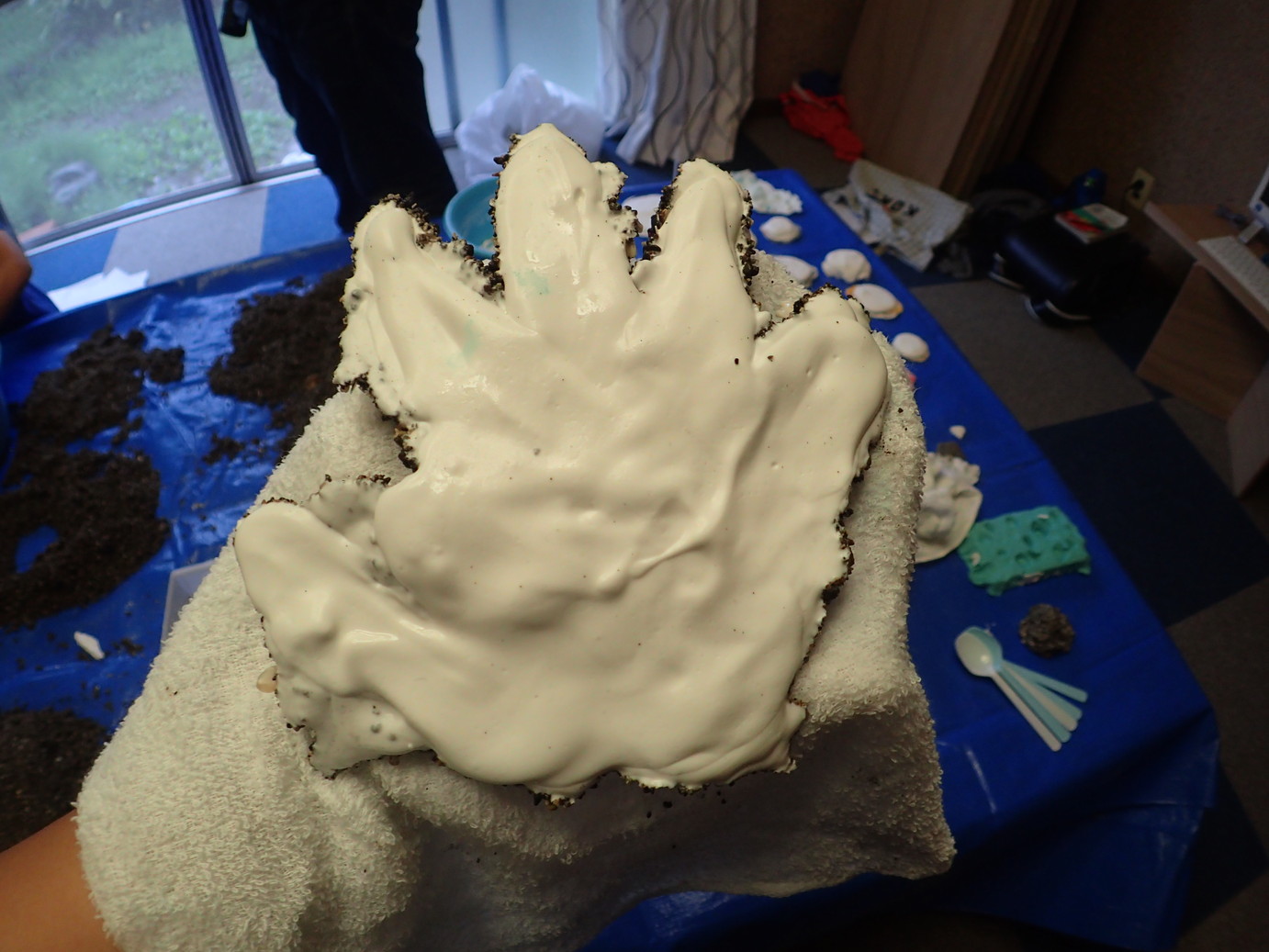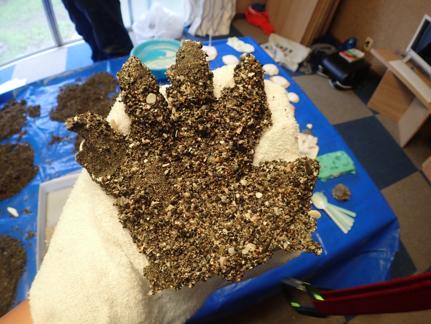 硬化してから掘り出してみると、指で開けた穴もしっかりとかたちを残して写し取れていました。