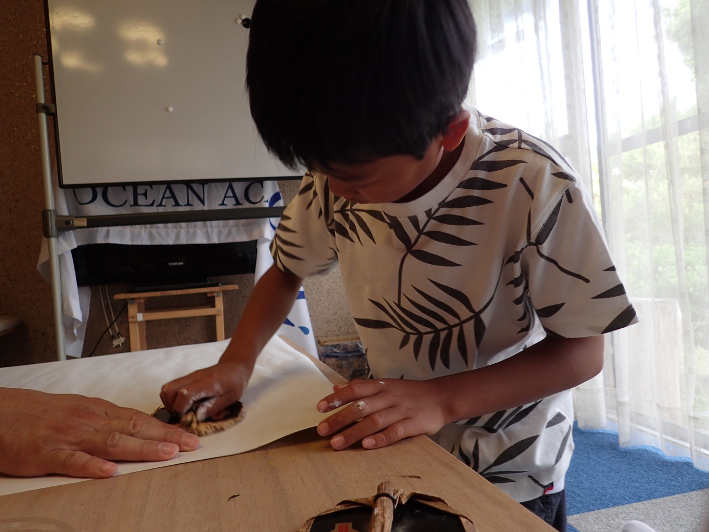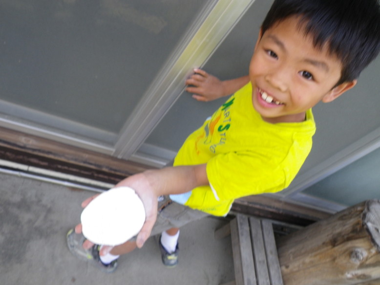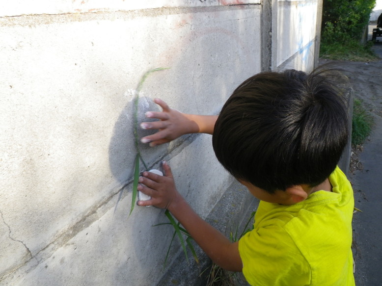 Homeに帰ると早速お家から持ち寄ってくれた花や石と、山で集めた材料を合わせての絵の具つくりが始まり、足りない色も補充できて十分な色数の絵の具が出来あがりました。